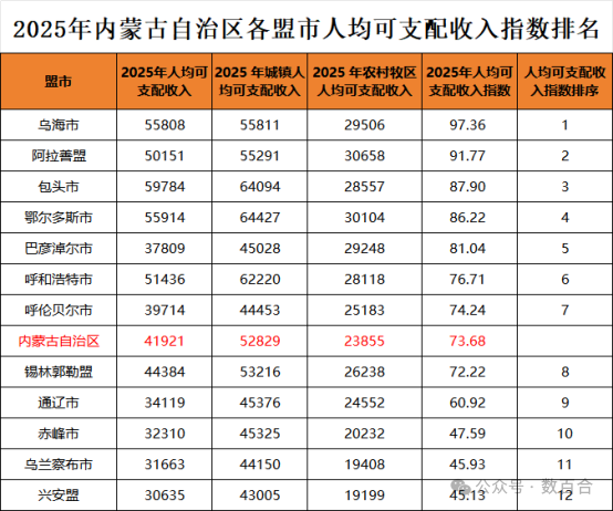 2025年内蒙古自治区全体居民人均可支配收入41921元,对应人均可支配收入指数73.68。12盟市指数呈现西部明显领先、中部居中、东部靠后的梯队分布,高低差值显著,头部盟市与尾部盟市差距突出。