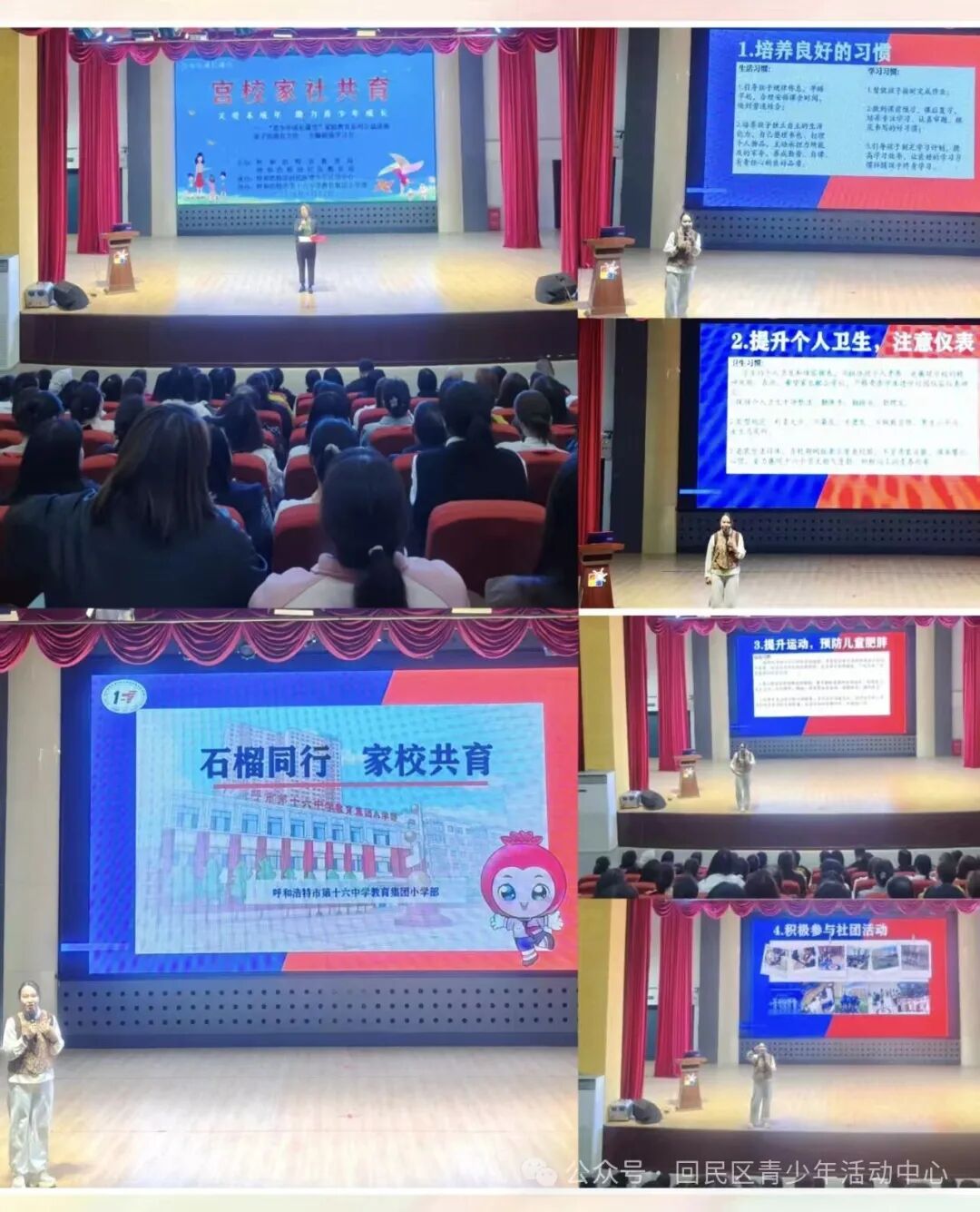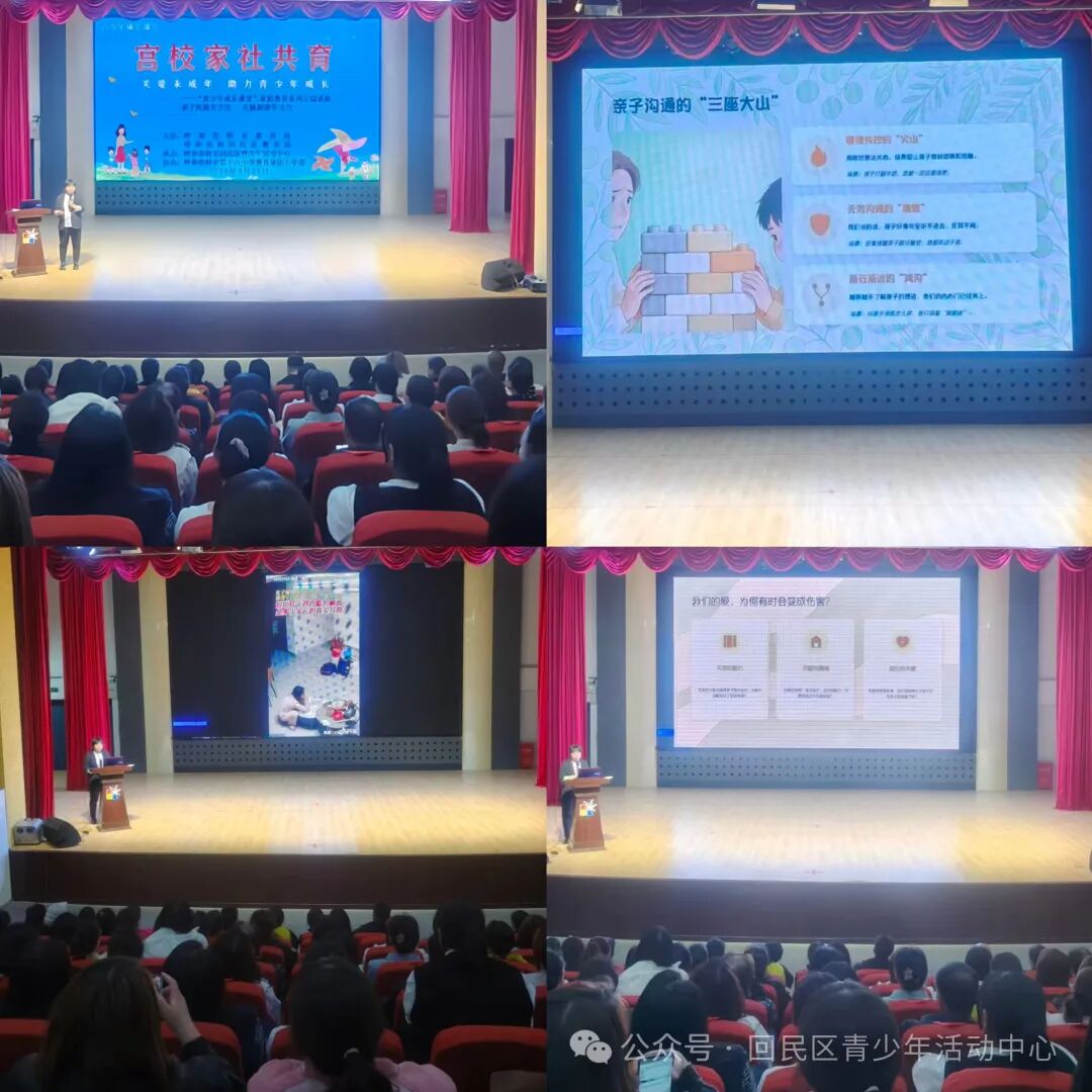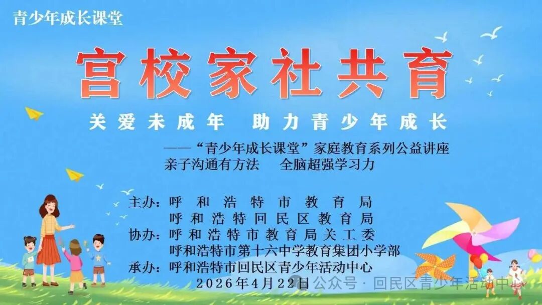 为深入贯彻落实“五育并举”教育理念,构建宫、校、家、社四方协同育人新格局,切实提升家庭教育指导服务水平,助力青少年健康快乐成长。2026年4月22日,由呼和浩特市教育局、呼和浩特回民区教育局主办,呼和浩特市教育局关工委、呼和浩特市第十六中学教育集团小学部协办,回民区青少活动中心承办的“宫校家社共育”·关爱未成年人 助力青少年成长——家庭教育系列公益讲座,在回民区青少年活动中心内温暖开讲。