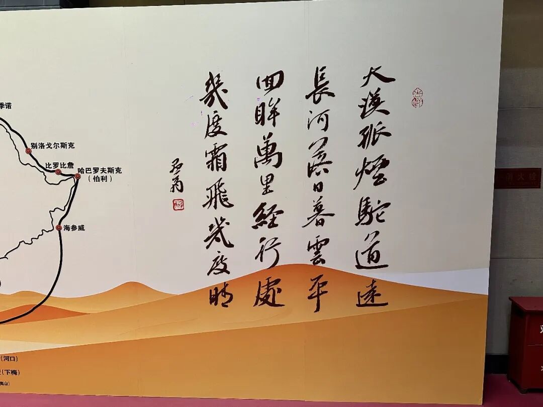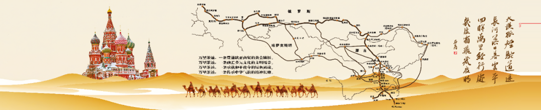 在活动开始前布置会场时,我和我的合作伙伴、内蒙古著名策划人张雷先生一同看着这幅巨型万里茶道路线海报,心中感慨万千。我便提议,请他以万里茶道与大盛魁文化产业二十余年的坚守与历程为题,创作一首七绝。他当即挥笔写下这首诗:“大漠孤烟驼道远,长河落日暮云平。回眸万里经行处,几度飞霜几度晴。”